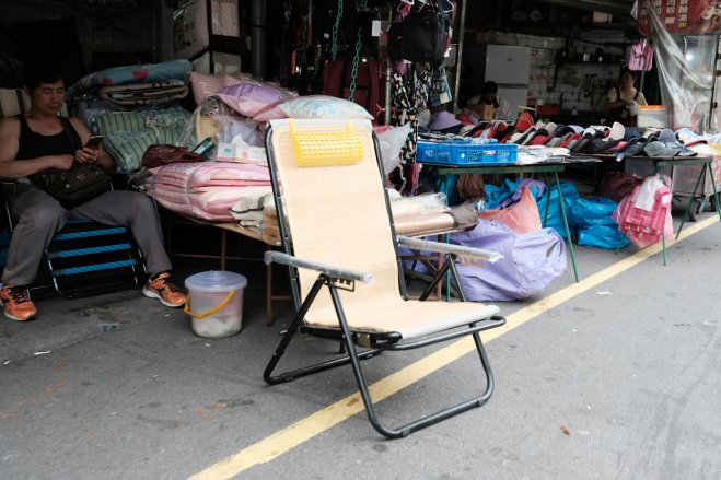 Yellow chair, Keelung, Taiwan A yellow chair sits empty along a street lined with small shops, in Keelung, Taiwan.