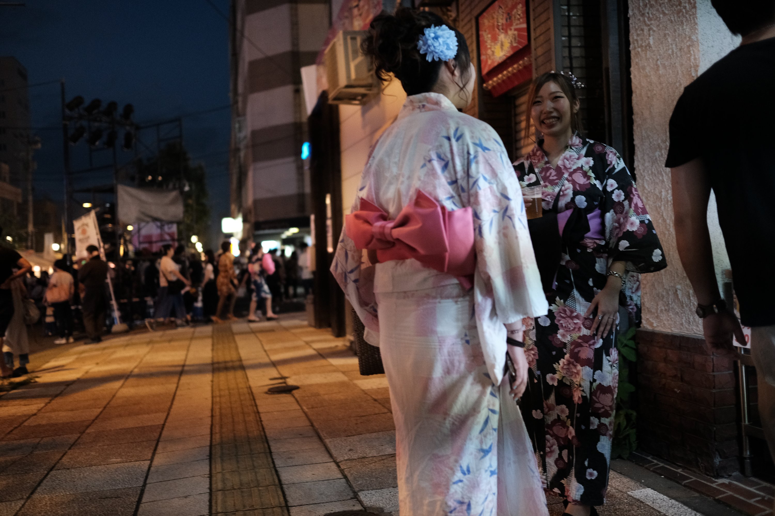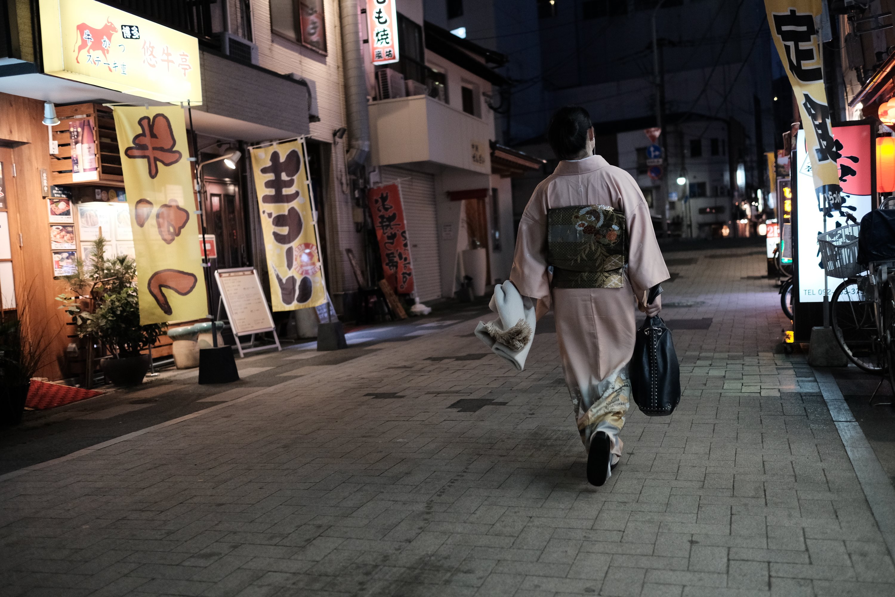 Girls in kimonos walk past a blue bench in Kumamoto, Japan.