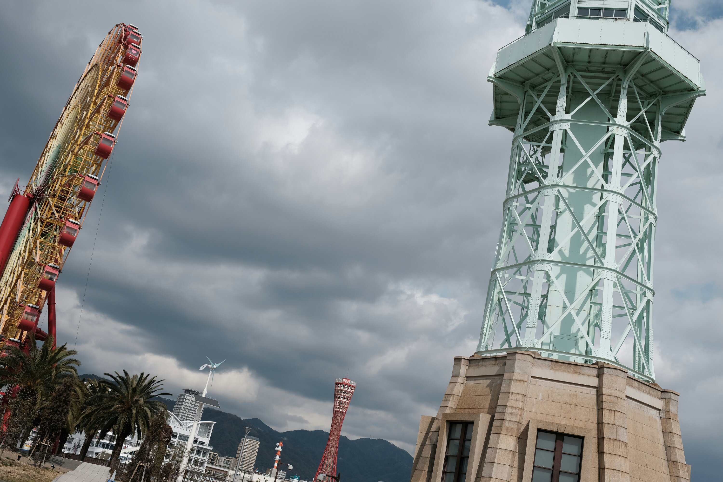 The Old Kōbe Harbor Signal Tower, Mosaic Ferris Wheel, and Kōbe Port Tower rise up over Harborland, in Kōbe, Japan.