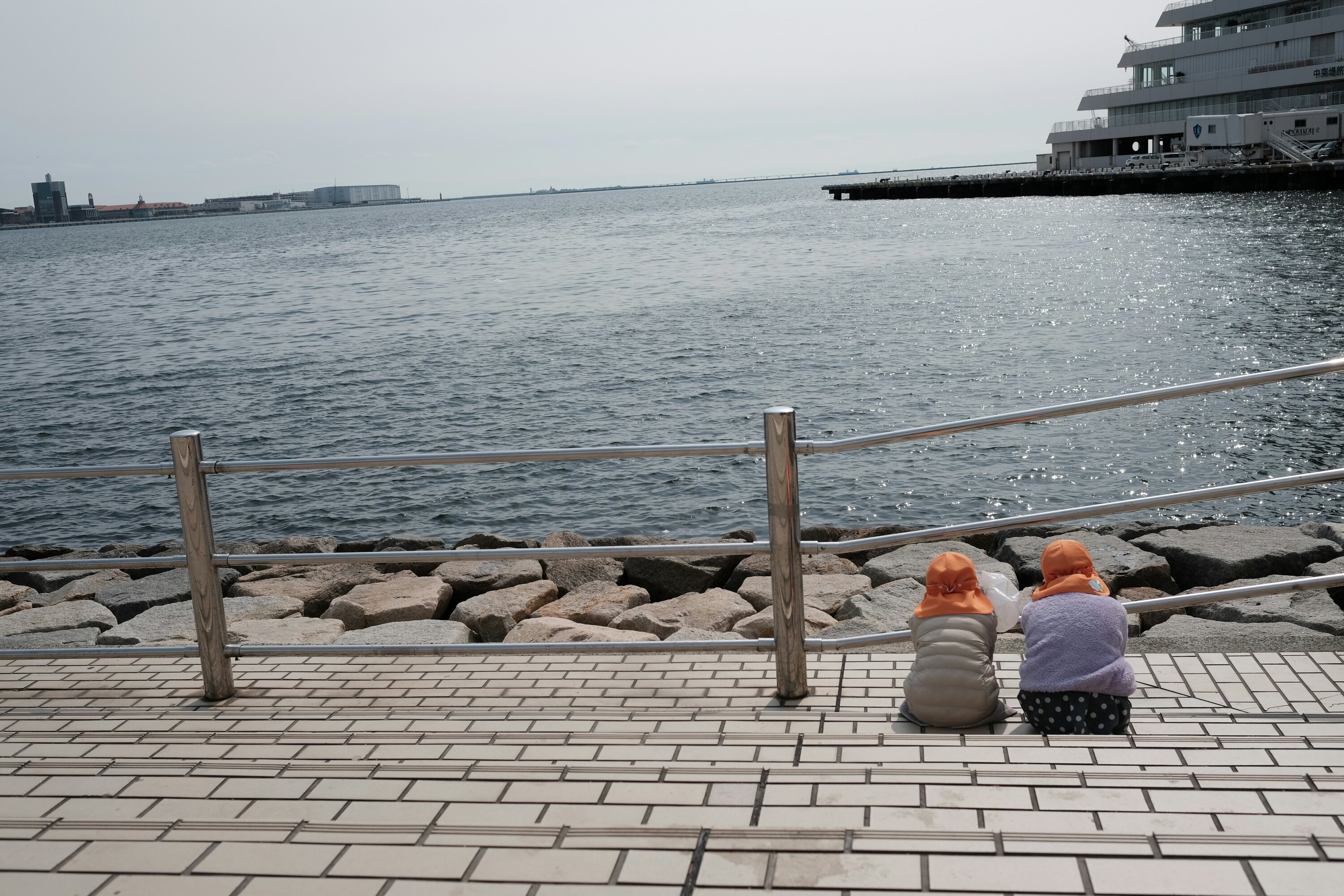 Two girls looking out to sea on the waterfront of Meriken Park in Kōbe, Japan.