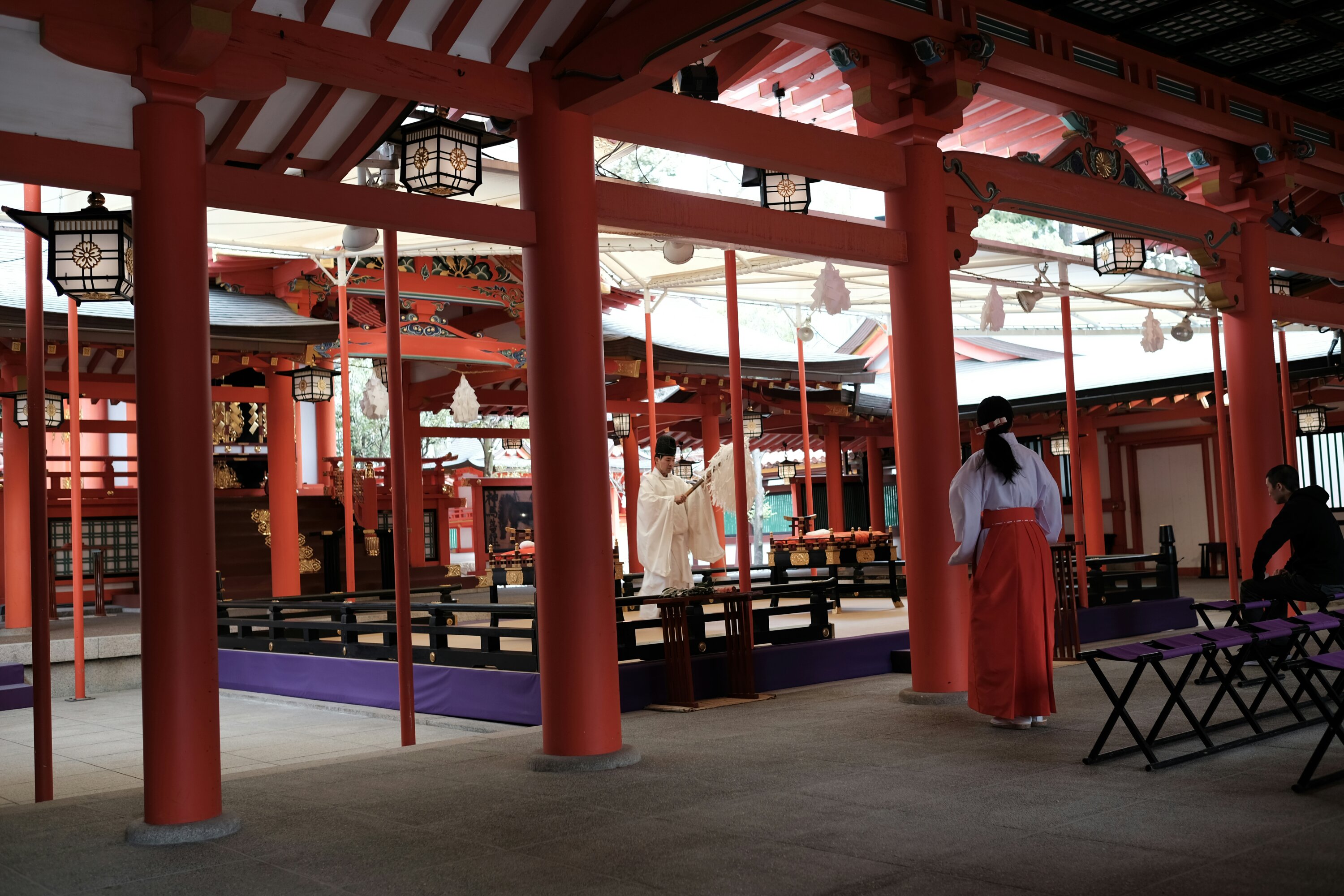 A Shinto priest performs a ceremony at Ikuta-jinja in Kōbe, Japan.