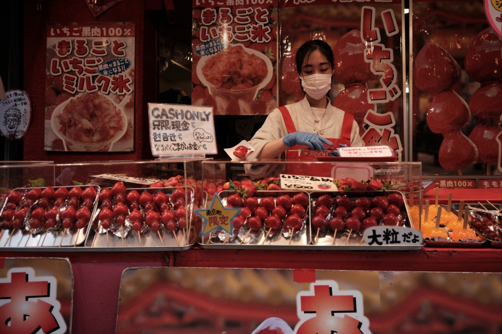 A girl working at an ichigo ame booth in Kōbe, Japan.