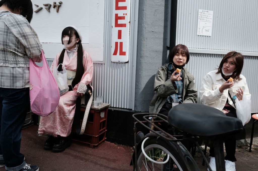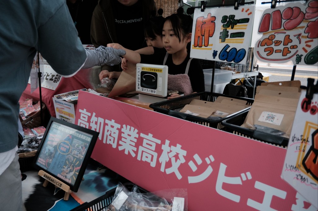 A girl gives change to a customer at the Sunday market in Kōchi, Japan.