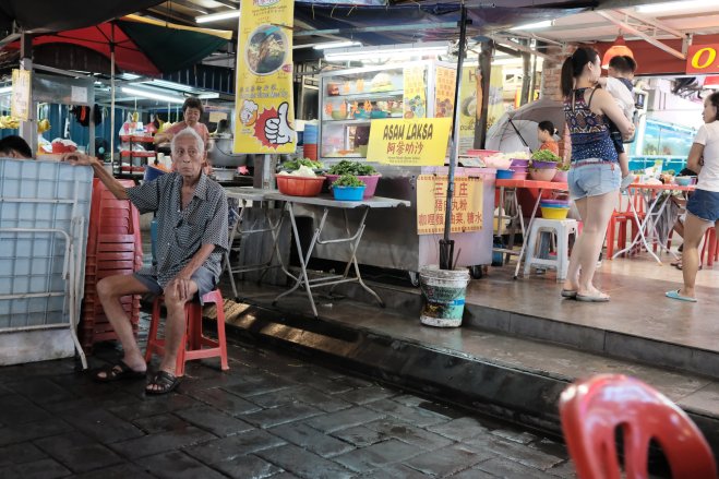 Man sitting next to food stall, Kuala Lumpur, Malaysia A man sitting next to a food stall on Jalan Alor in Kuala Lumpur, Malaysia.
