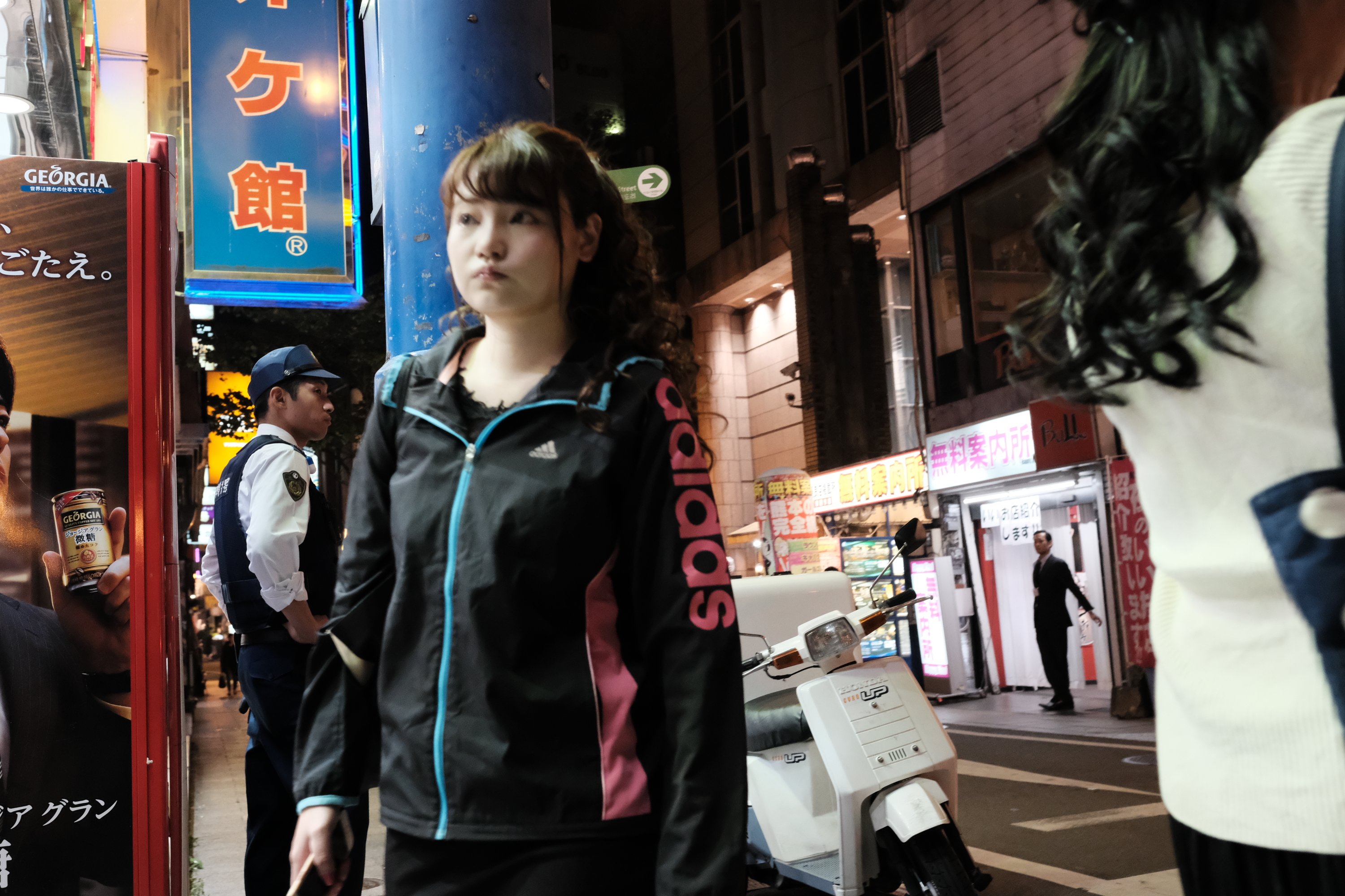 Girl scratching her head, Kumamoto, Japan A girl scratches her head as she holds up a shirt displayed in front of a shop in Kumamoto, Japan.