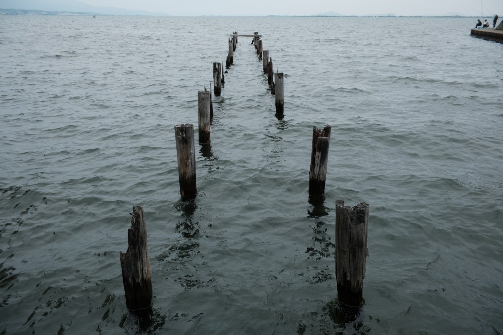 A fisherman walking along the shore of Biwako in Ōtsu, Japan.