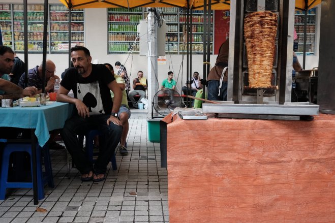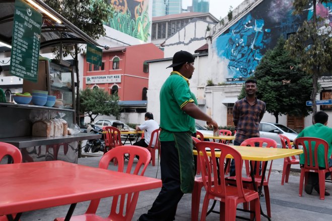 Man waits for next customer, Kuala Lumpur, Malaysia A man takes a seat as he waits for the next customer at a food stall in Kuala Lumpur, Malaysia.