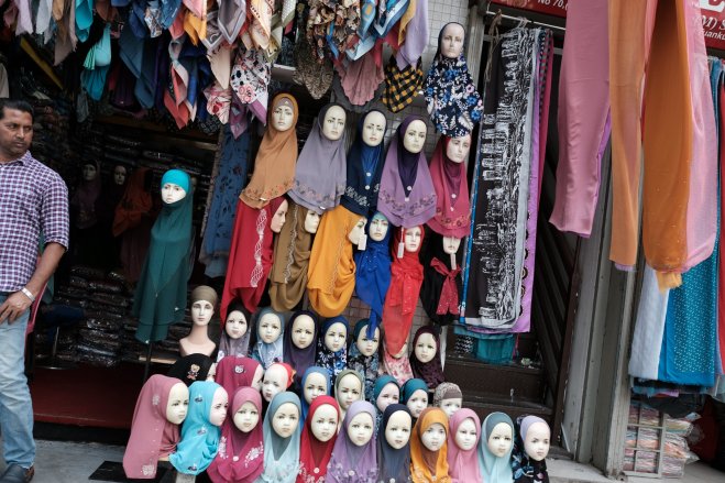 Man and mannequins, Kuala Lumpur, Malaysia A man and some mannequins at a store selling headscarves in Kuala Lumpur, Malaysia.
