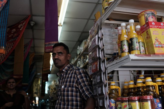 Man sitting on steps, Kuala Lumpur, Malaysia A man sitting on the steps in front of a fabric shop in Kuala Lumpur, Malaysia.