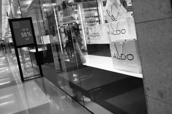 Woman in display window, Bangkok, Thailand A woman fixing a window display at a mall in Bangkok, Thailand.