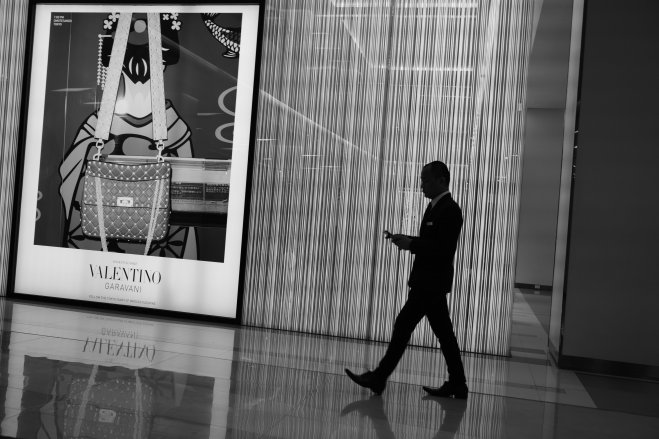 Man walking by store poster, Bangkok, Thailand A man walks by a large store poster at a mall in Bangkok, Thailand.
