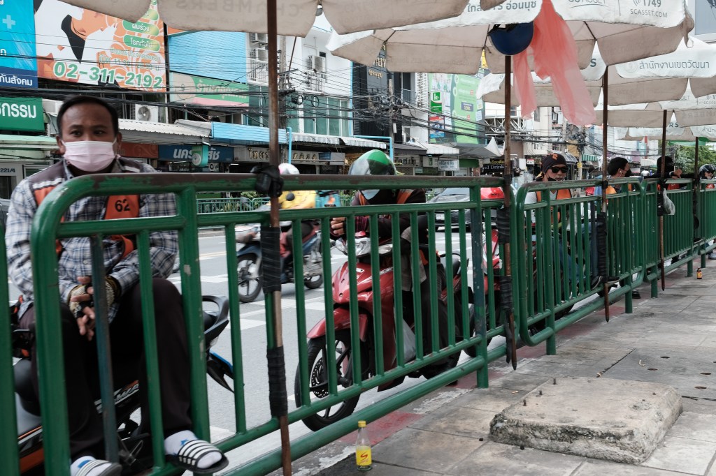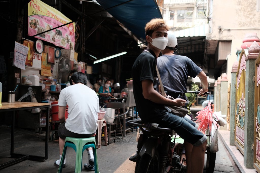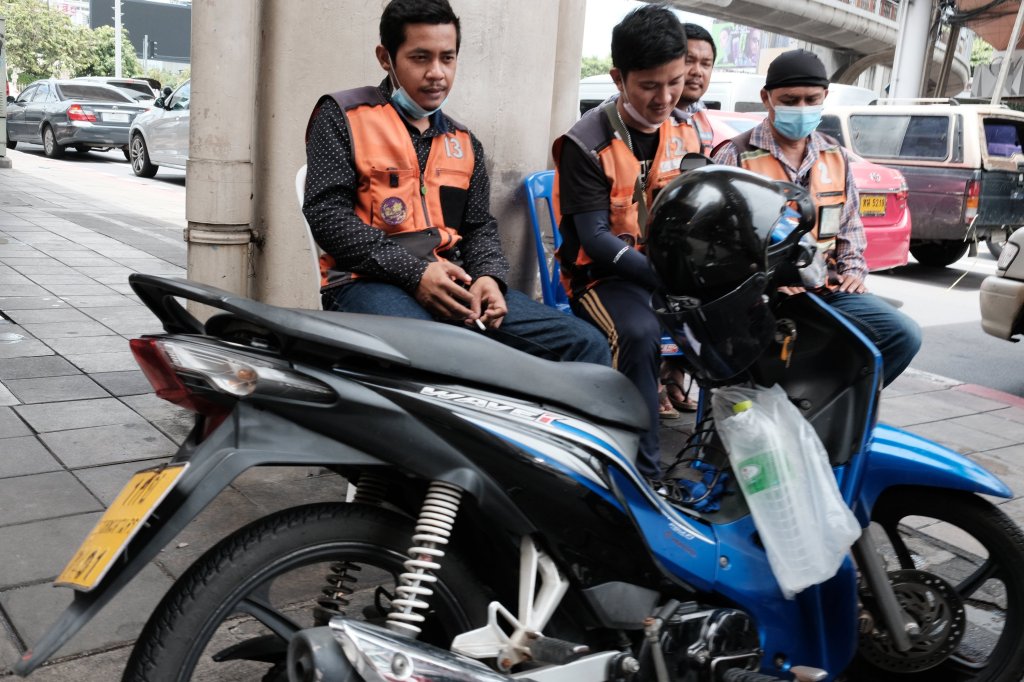 Guy sitting on back of motorbike, Bangkok, Thailand A guy sitting on the back of a motorbike in Bangkok, Thailand.
