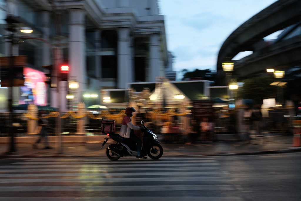 Motorbike by Erawan Shrine, Bangkok, Thailand A motorbike zooms by Erawan Shrine in Bangkok, Thailand.