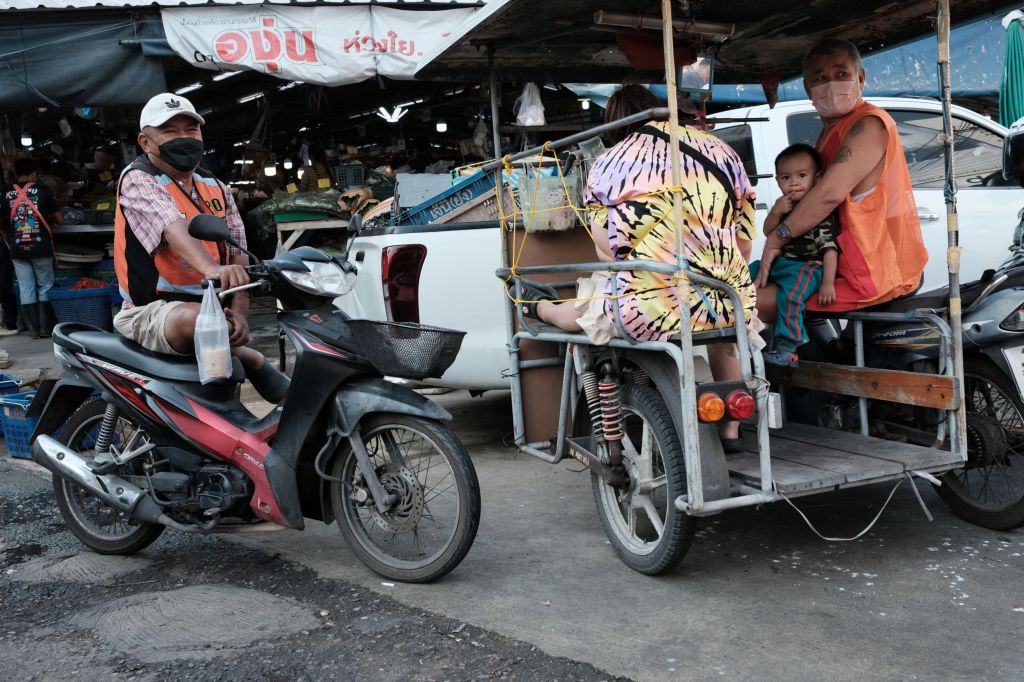 People waiting outside market, Samut Prakan, Thailand People waiting outside a market in Samut Prakan, Thailand.