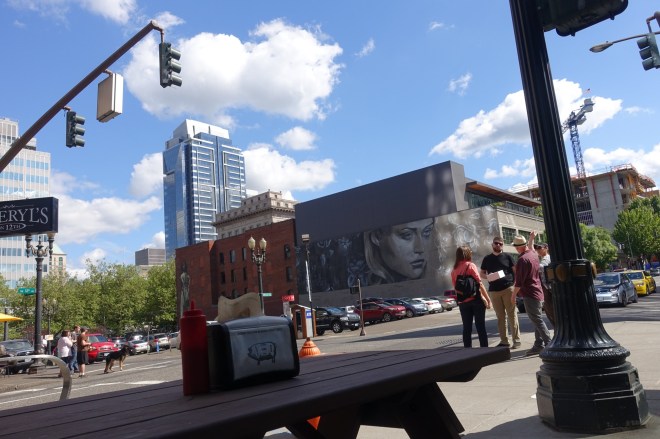 Napkins and mural art, Portland, USA As in many places throughout the city, mural art decorates these walls in downtown Portland, Oregon, USA.