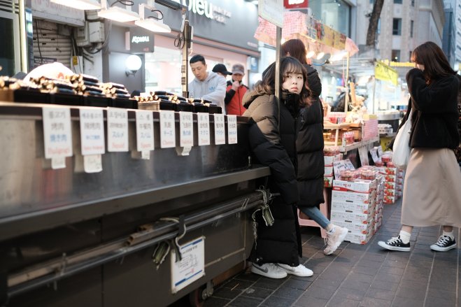 Girl at gimbap stand, Seoul, South Korea A girl at a gimbap stand in Myeongdong, in Seoul, South Korea.