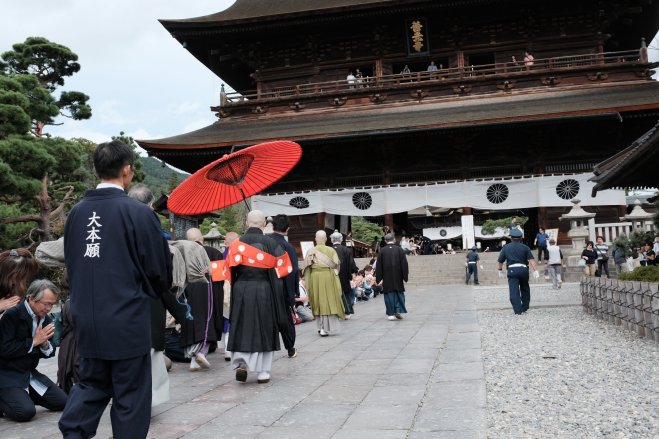 Man hanging plaques, Nagano, Japan A man hangs plaques that have been blown around on a windy day at Zenkō-ji in Nagano, Japan.