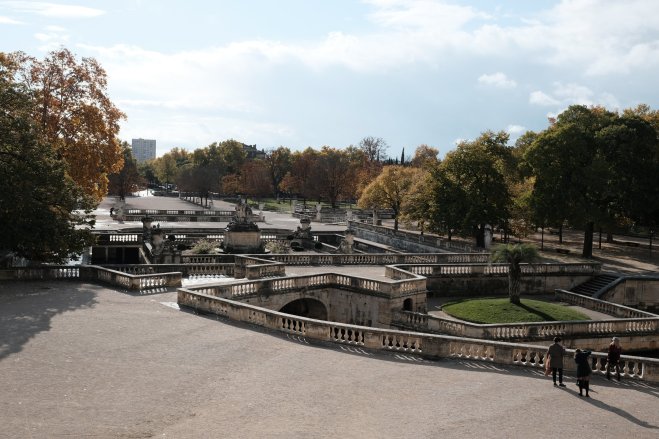 Girl running by fountain, Nîmes, France A girl runs by the fountain at Place du Chapitre in Nîmes, France.