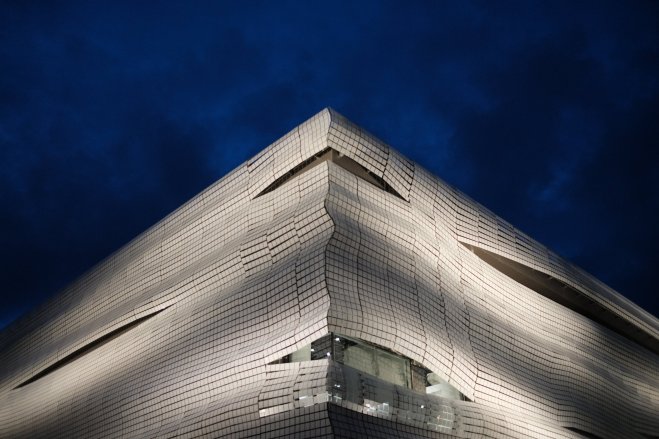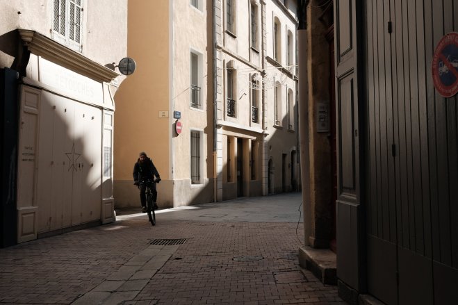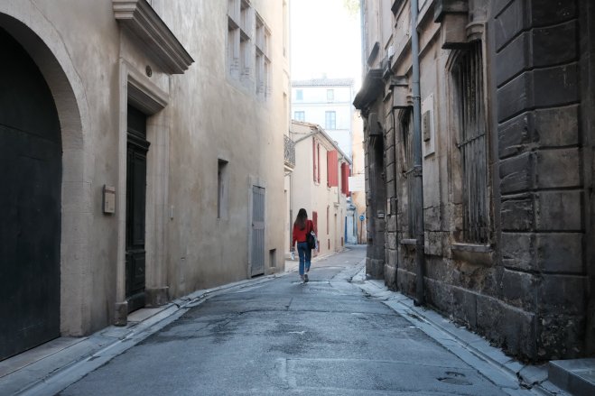 Lady in red sweater, Nîmes, France A young lady in a red sweater walking down a street in Nîmes, France.