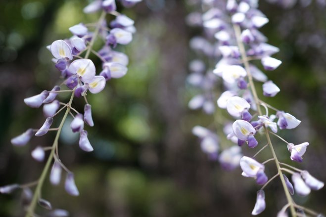 Wisteria in bloom hanging from a trellis at Ogi-kōen in Ogi, Japan.