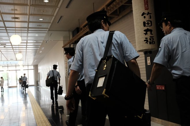 Train conductors, Ōita, Japan Train conductors heading out to the tracks at Ōita Station in Ōita, Japan.