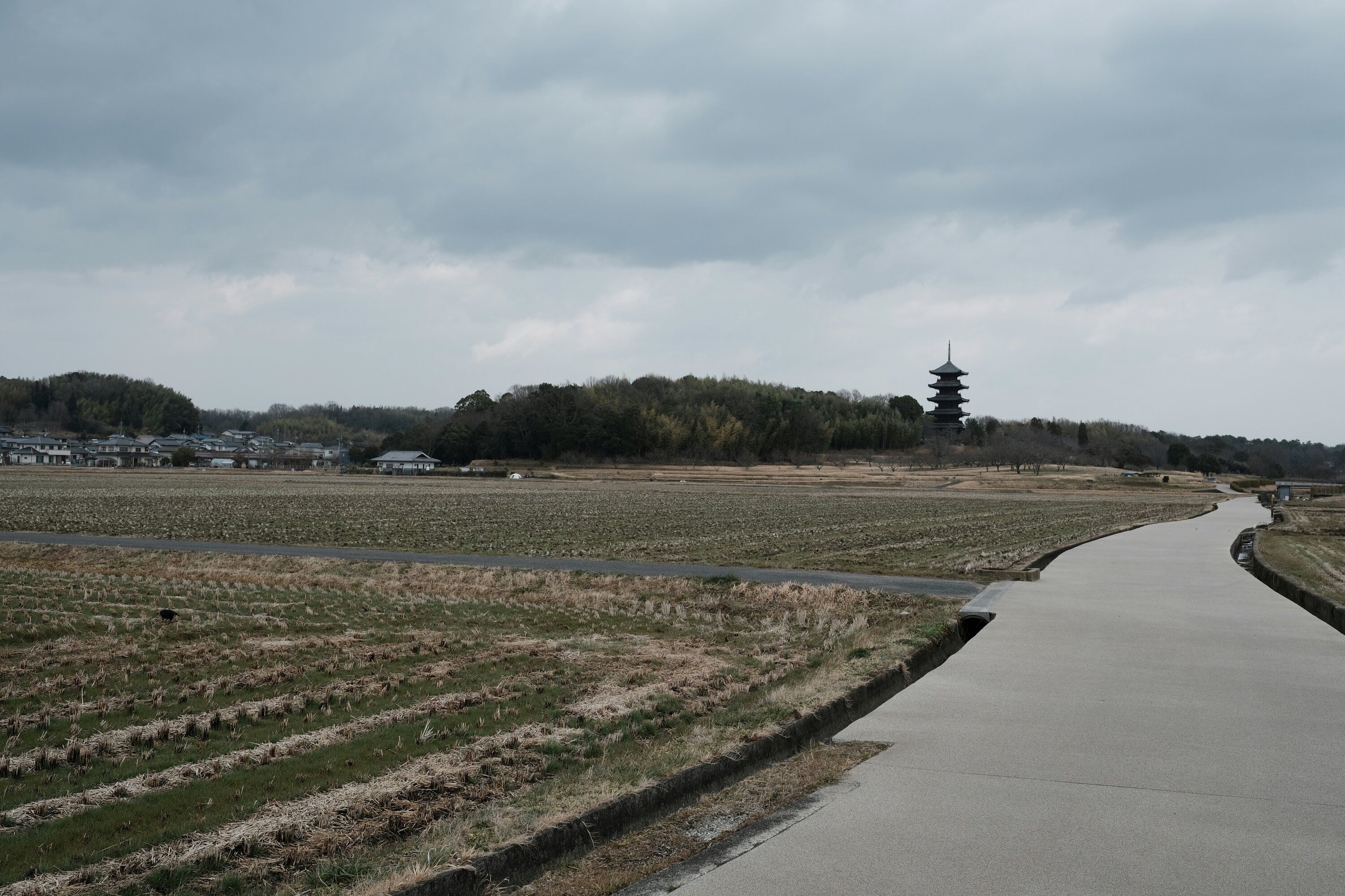 Five-story pagoda, Soja, Japan The five-story pagoda of the Bitchū Kokubun-ji rises up in the distance along the Kibi Plain bicycle road in Soja, Japan.