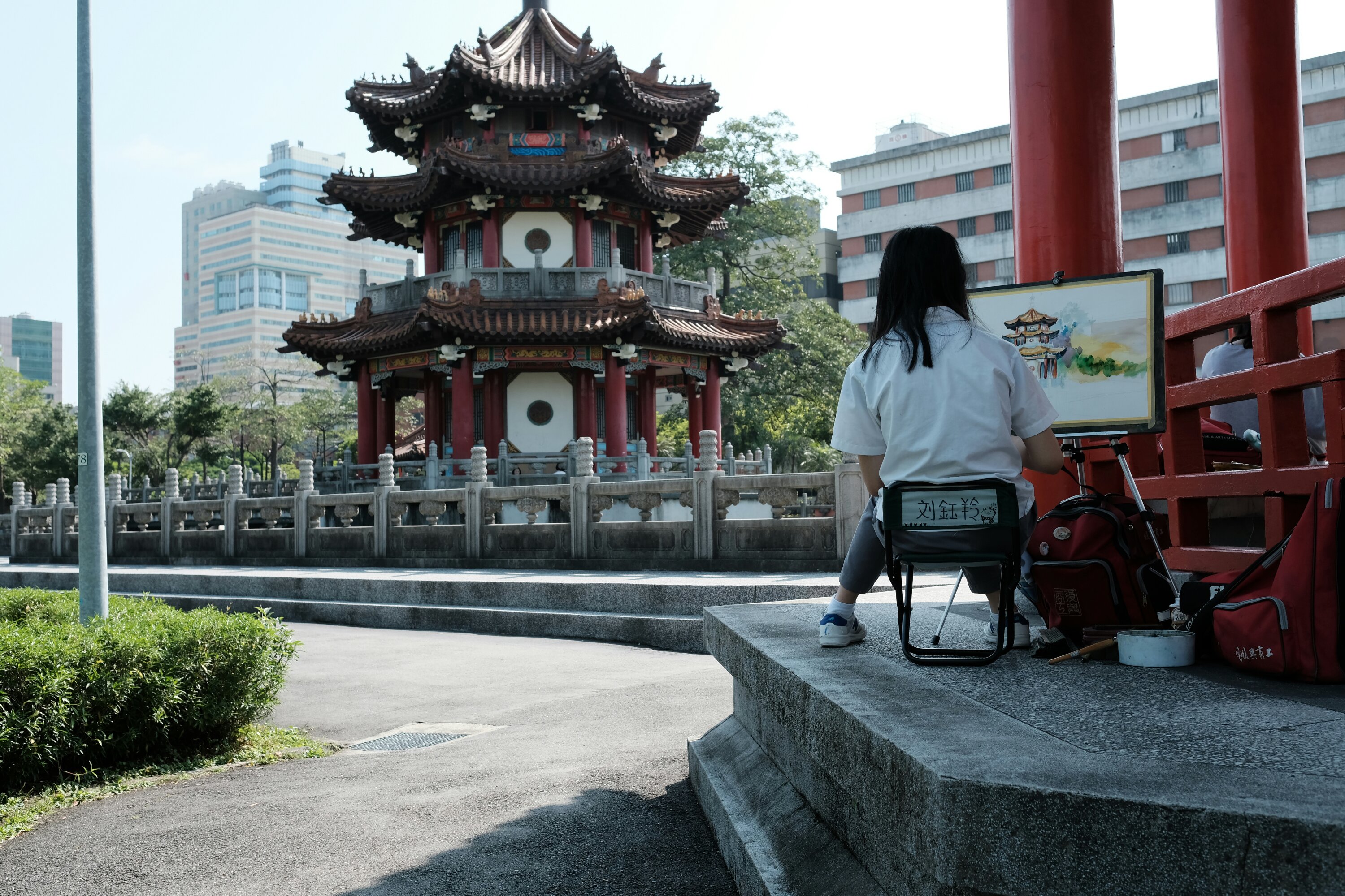 Painting the pagoda, Taipei, Taiwan An art student paints the pagoda at 2-28 Peace Park in Taipei, Taiwan.