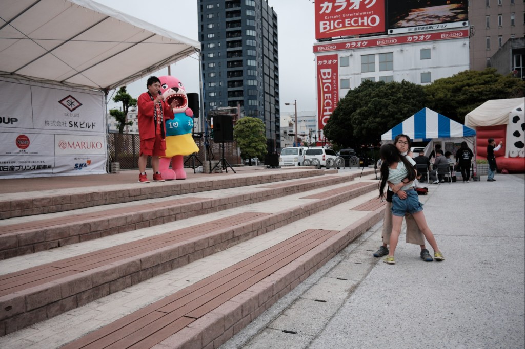 A boy lies on the grass after rolling down a hill in Yawatahama, Japan.