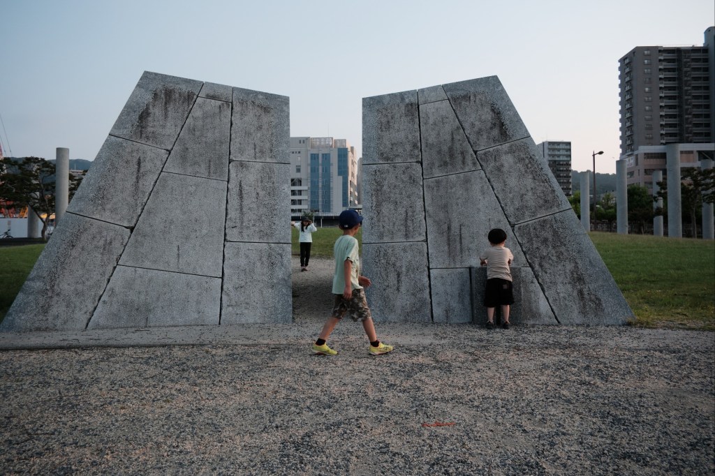 People and a sculpture sitting on benches at Hisayaōdōri-kōen in Nagoya, Japan.