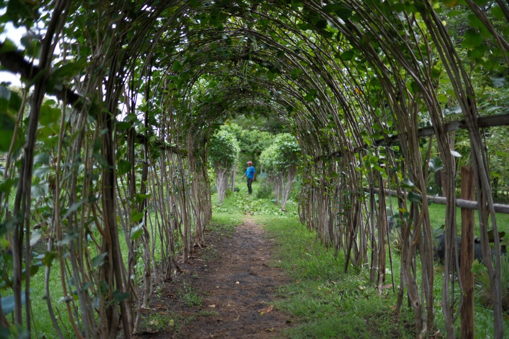 A gardener seen through an archway at Vachirabenjatas Park in Bangkok, Thailand.