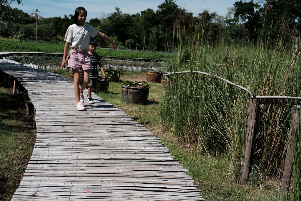Sister and brother on a walkway in Vachirabenjatas Park in Bangkok, Thailand.