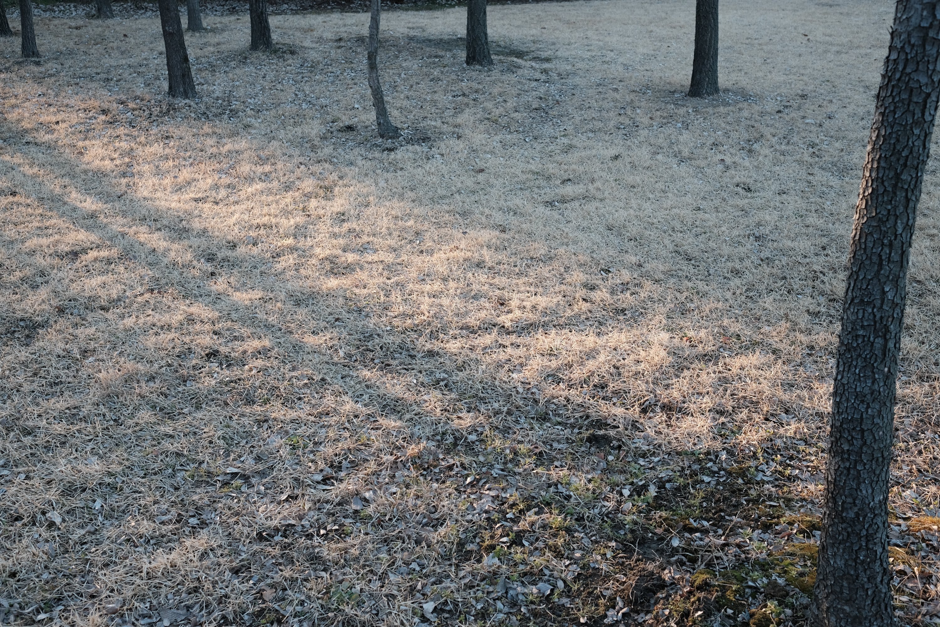 Brown grass and tree trunks, Daejeon, South Korea Brown grass, tree trunks, and long shadows at a park in Daejeon, South Korea.