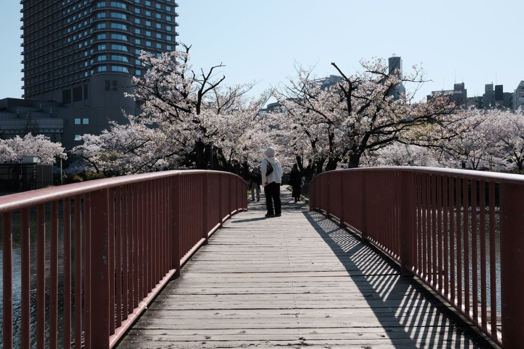 Woman crossing bridge, Ōsaka, Japan A woman pauses to view the cherry blossoms at Kema Sakuranomiya-kōen in Ōsaka, Japan.