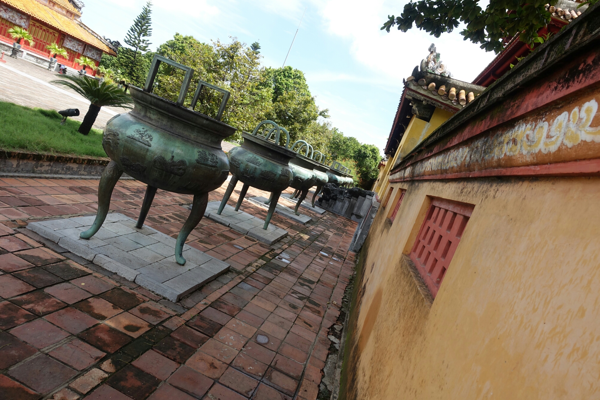 Nine Dynastic Urns, Hue, Vietnam The Nine Dynastic Urns, each dedicated to an emperor, stand in front of the Hien Lam Cac pavilion in the Imperial City in Hue, Vietnam.
