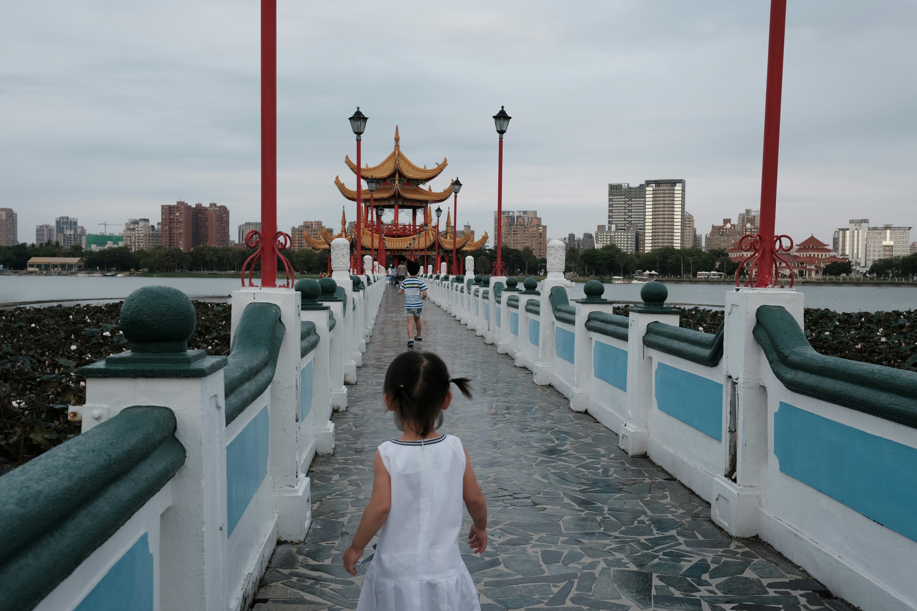 On the bridge to Wuli Pavilion, Kaohsiung, Taiwan A little girl and boy cross the bridge to the Wuli Pavilion on Lotus Lake, in Kaohsiung, Taiwan.