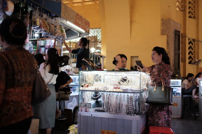 Ladies at jewelry counter, Phnom Penh, Cambodia Two ladies at a jewelry counter inside Psar Thmei, in Phnom Penh, Cambodia.