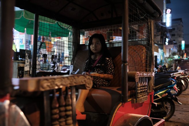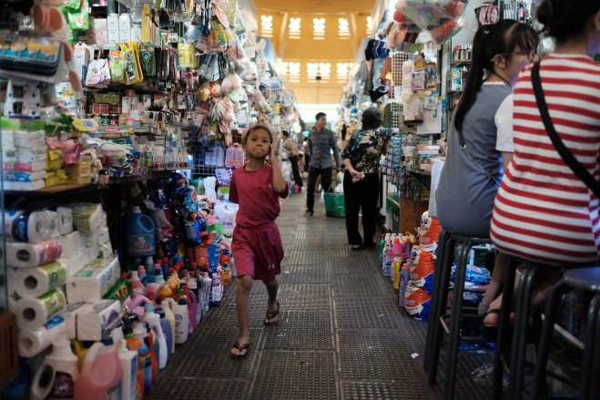 Girl walks down aisle, Phnom Penh, Cambodia A girl walks down an aisle inside Psar Thmei, in Phnom Penh, Cambodia.