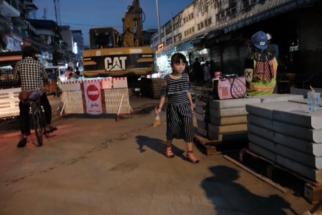 Girl walks by construction site, Phnom Penh, Cambodia A girl walks by a construction site in the streets of Phnom Penh, Cambodia.