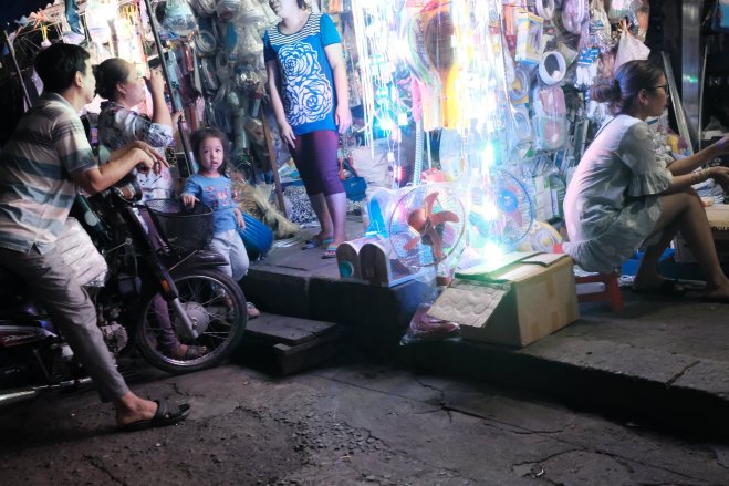 Girl and light display, Phnom Penh, Cambodia A girl standing next to a light display at a store in Phnom Penh, Cambodia.