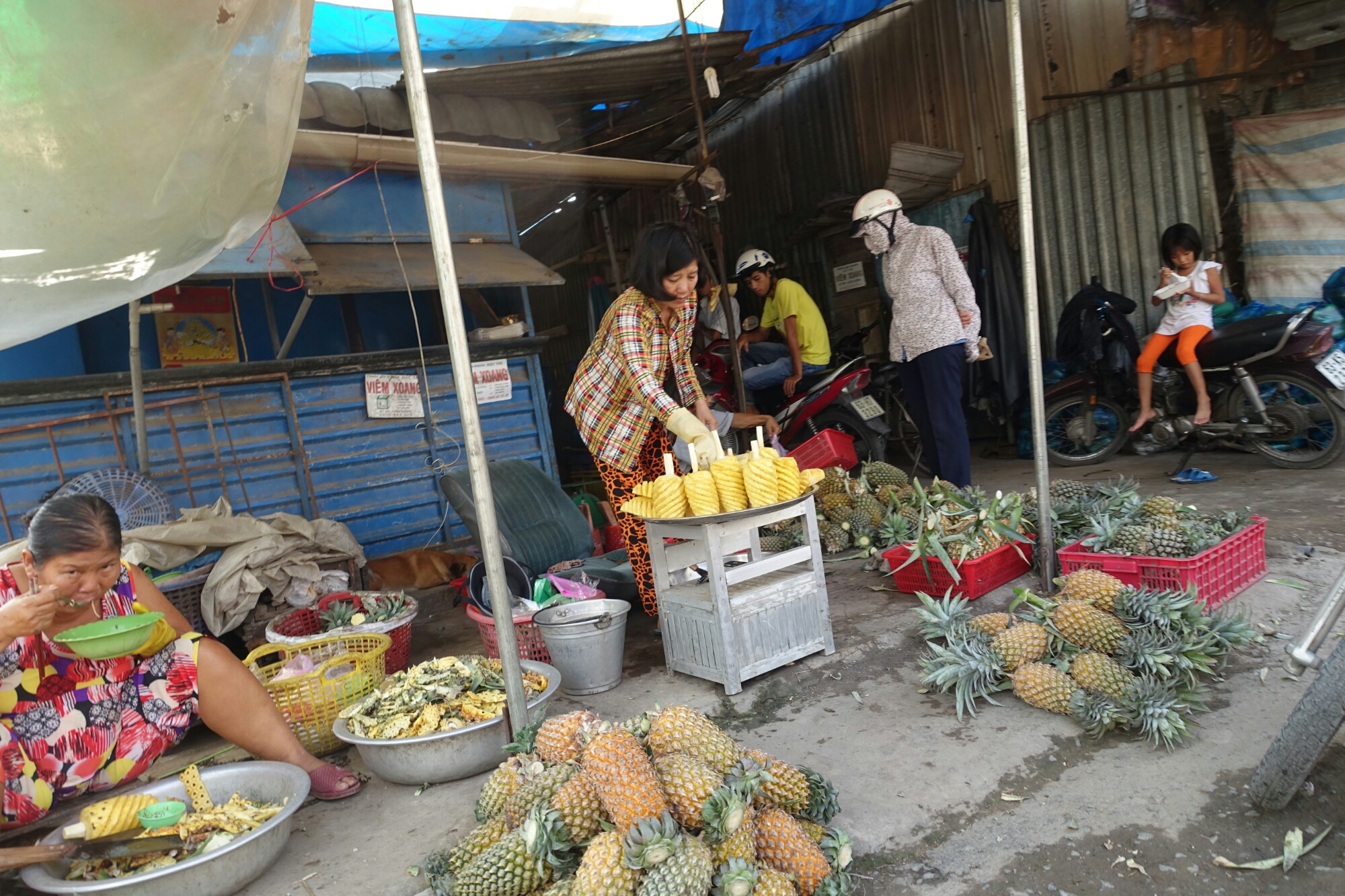 Pineapple stand, My Tho, Vietnam Freshly pared pineapple on a stick is available for sale at the market in My Tho, Vietnam.