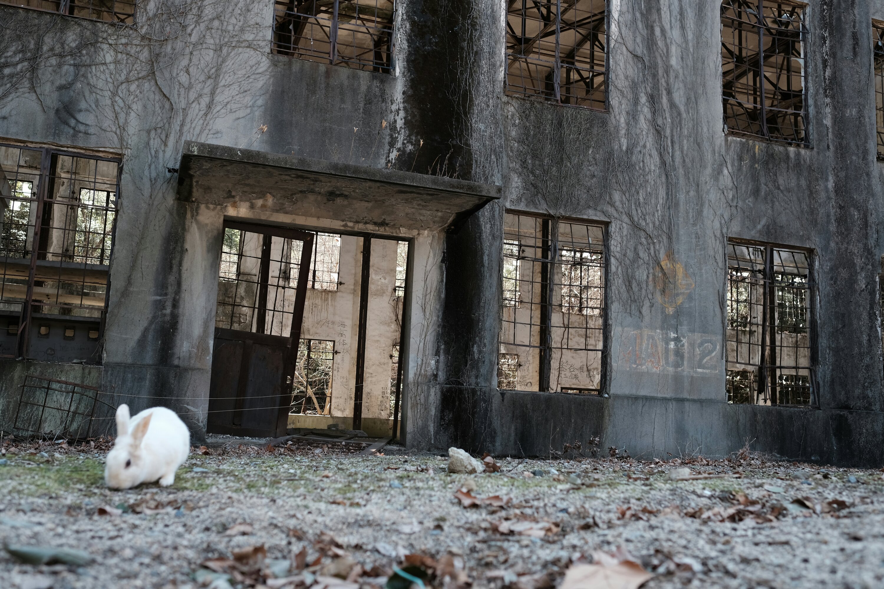 Abandoned building and rabbit, Ōkunoshima, Japan A rabbit nibbles the grass in front of an abandoned building that was once a power plant on Ōkunoshima, Japan.