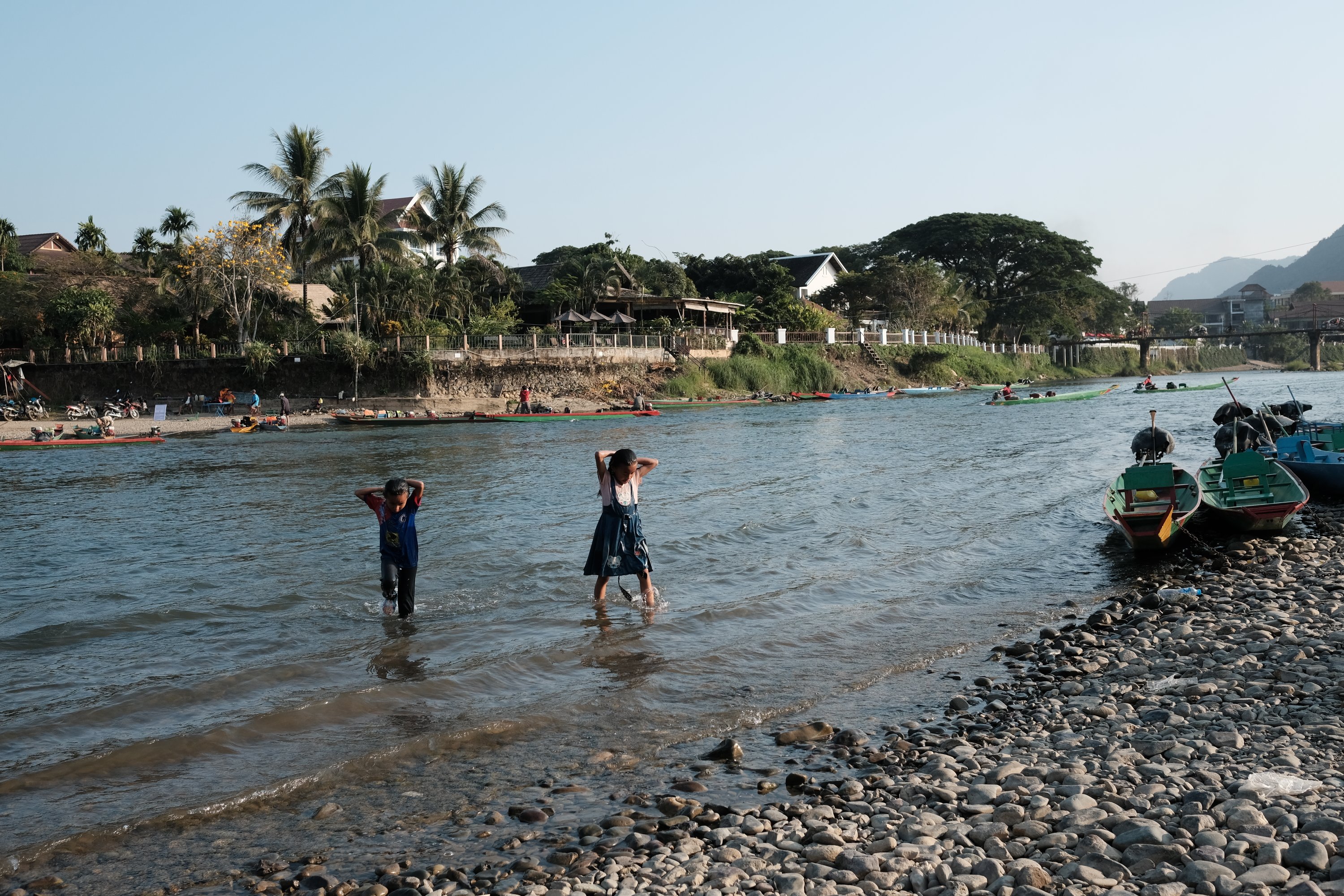 Two girls washing in river, Vang Vieng, Laos Two girls washing their hair in the Nam Song, in Vang Vieng, Laos.