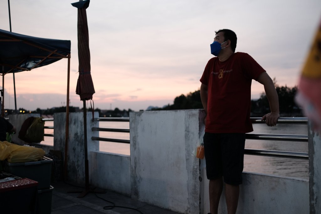 Man leaning on railing, Ratchaburi, Thailand A man leans on the railing along the Mae Klong in Ratchaburi, Thailand.