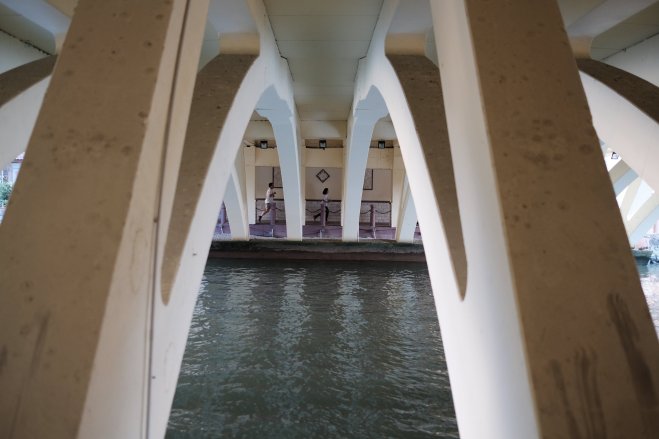 Joggers under a bridge, Melaka, Malaysia Joggers pass under a bridge along the Melaka River, in Melaka, Malaysia.