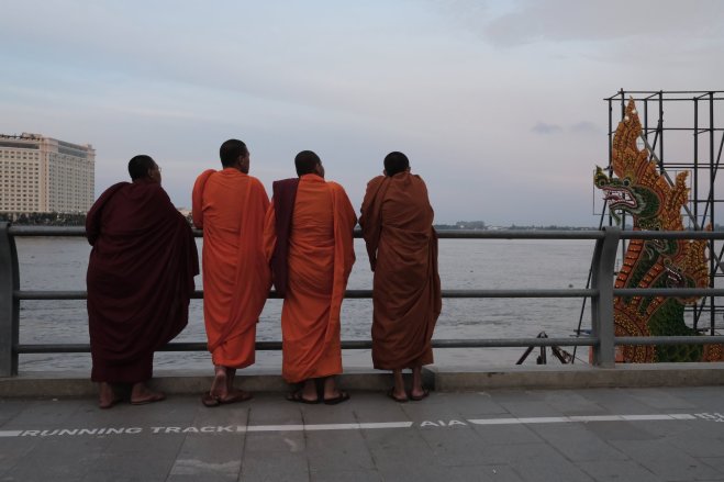 Monks admiring a display, Phnom Penh, Cambodia Four monks admiring a floating display on the Tonle Sap River in Phnom Penh, Cambodia.