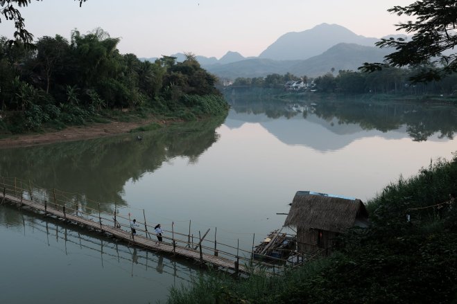 Girls running across bamboo bridge, Luang Prabang, Laos Two schoolgirls run across a bamboo bridge over the Nam Khan in Luang Prabang, Laos.