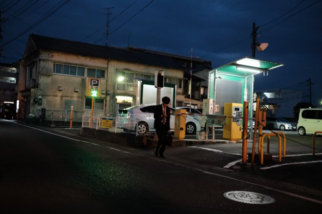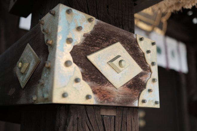 A metal plate on a column of the gate at Matsubara-jinja in Saga, Japan.
