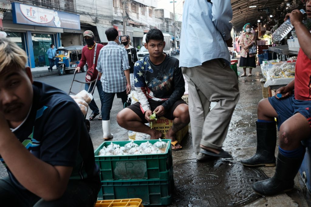 A guy sitting on a crate at a market in Samut Prakan, Thailand.