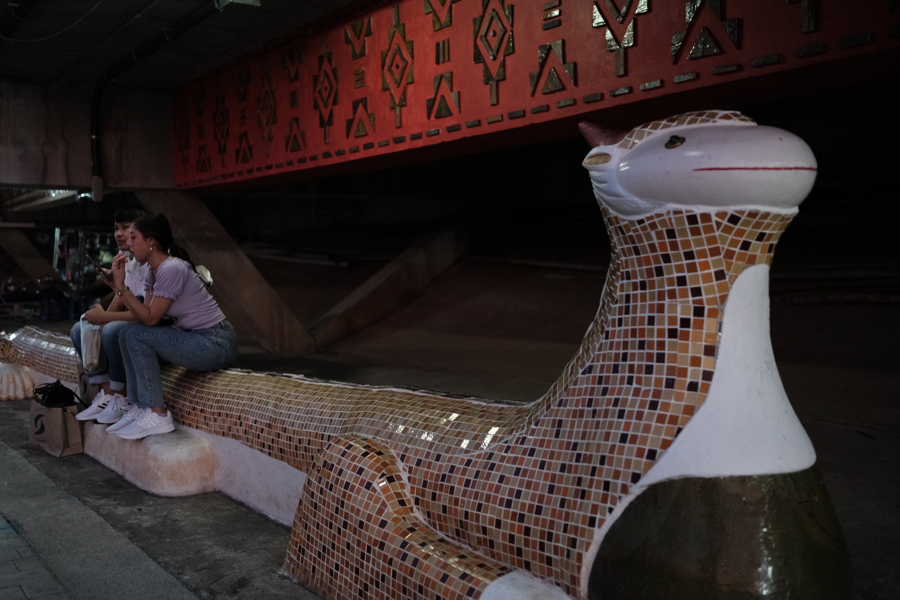People and a sculpture sitting on benches at Hisayaōdōri-kōen in Nagoya, Japan.