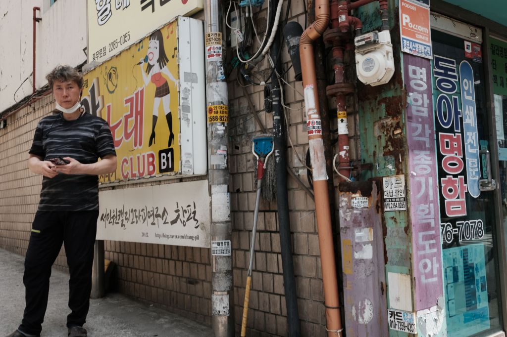 A boy walks by a man in a shoe store at Namdaemun Market in Seoul, South Korea.